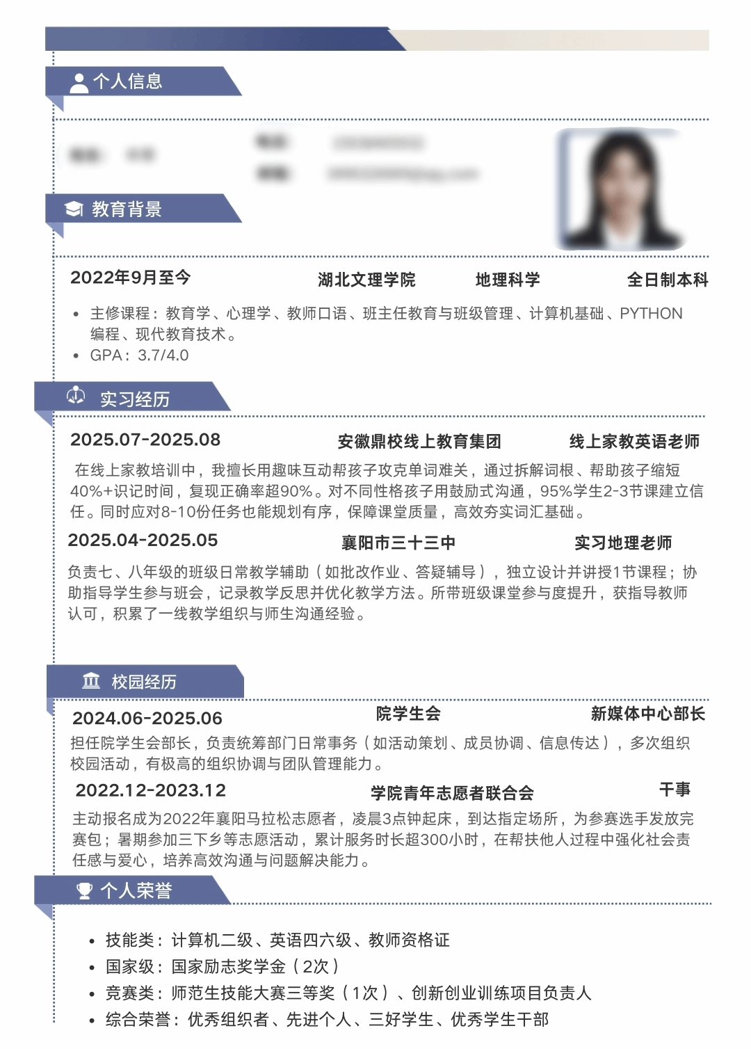 本次活动聚焦简历撰写的实用性与针对性,李雨萌老师结合资源环境、旅游管理等专业的就业方向,围绕简历的内容架构、亮点提炼、岗位适配等核心维度展开细致讲解。活动中,同学们结合自身专业特色与求职意向自主完成简历初稿撰写,随后通过线上一对一答疑、简历互评等环节,精准发现自身简历存在的问题与不足。李雨萌老师针对每份简历给出“突出专业实践经历”“量化实习成果”等具体优化建议,帮助同学们将专业优势、实践经验与岗位需求高效匹配,打造出更具竞争力的求职简历。