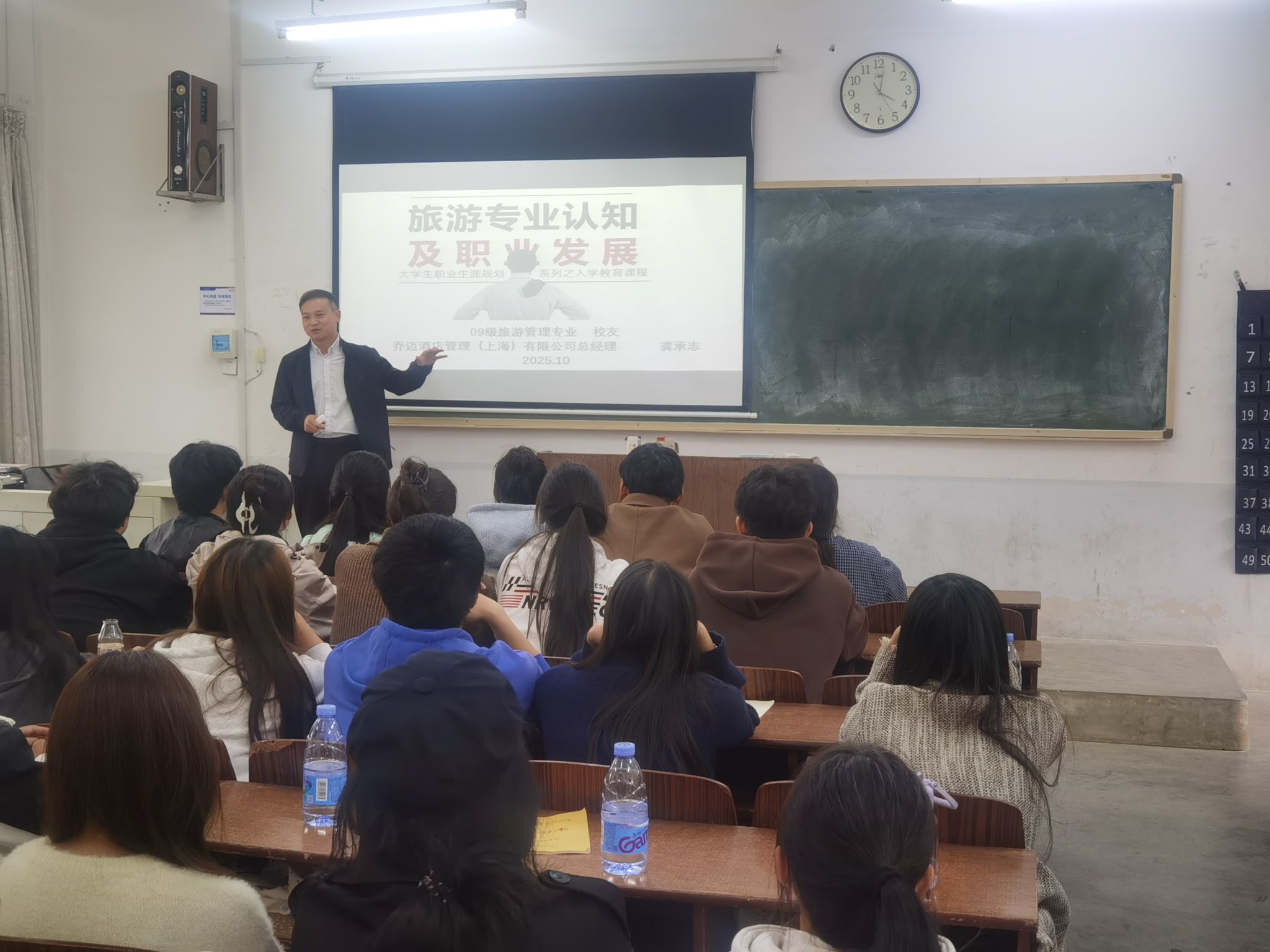 (通讯员 王天天)为帮助新生快速适应专业学习、明确职业发展方向,10月11日下午,资源环境与旅游学院在N4-103教室举办2025级旅游管理专业新生教育系列专题讲座。乔迈酒店管理(上海)有限公司总经理、2012届校友龚承志应邀担任主讲,资环学院副院长龙雨萍、旅游管理系主任王天天及全体新生参加。