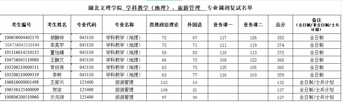 湖北文理学院2026年旅游管理专业硕士研究生调剂志愿考生复试成绩及拟录取名单公示