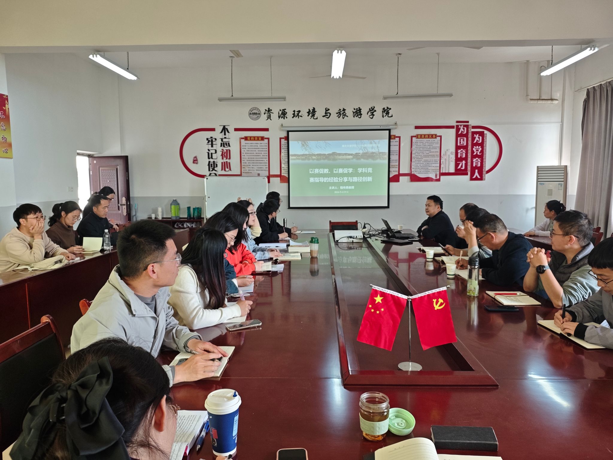 (资环学院 通讯员 李宇)为深化赛教融合机制建设,提升教师学科竞赛指导能力,4月9日,资源环境与旅游学院于2号楼331会议室举办2026年第三期教学沙龙活动。本次活动特邀经济管理学院程传勇教授作主题分享,主题为“以赛促教、以赛促学:学科竞赛指导的经验分享与路径创新”,学院全体专任教师到场参与。